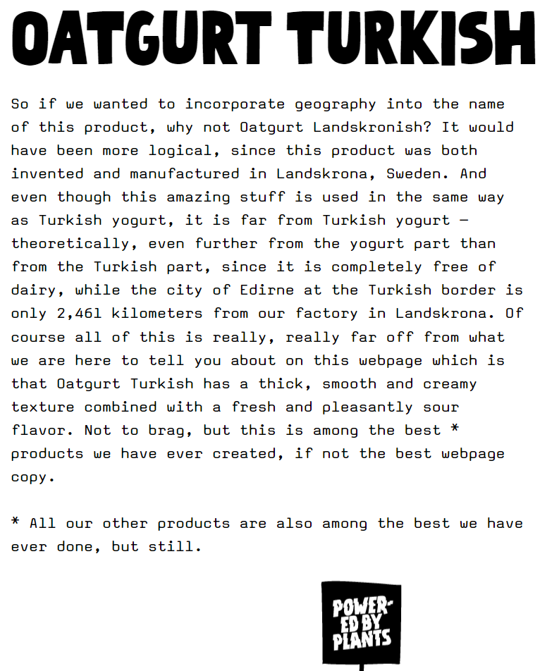 Şu an şirket değeri bir milyar doların üzerinde, bitkisel alternatif olarak endüstriye yön veriyor, hatta geçtiğimiz yıl bir İngiliz üreticisine “Pureoatly” marka tescili ihlali davası açtı. Büyük olay oldu, küçük işletmenin sempatizanları “Davut Golyat’a karşı” benzetmeleri yaptılar, yüzbin imza topladılar vs, ve mahkeme bir ihlal olmadığına karar verdi. Oatly olayı vakur ile karşıladı hatta fckoatly.com diye bir sayfa bile açtı, eleştirileri göğüslemek ve kendini savunmak için. Kaç şirket buna cesaret edebilir bilmiyorum ama hayranlık verici. Bu arada ben de bir esinlenme gördüm ama Oatly’nin yerinde olsam dava etmezdim. Onlar da önce güzellikle anlattık ama yapıcı bir diyalog şeklinde devam etmediği için dava etmek zorunda kaldık diyor. İşte ister insan ol, ister işletme, “büyüyünce” mutlaka bir arıza çıkarıyorsun.
