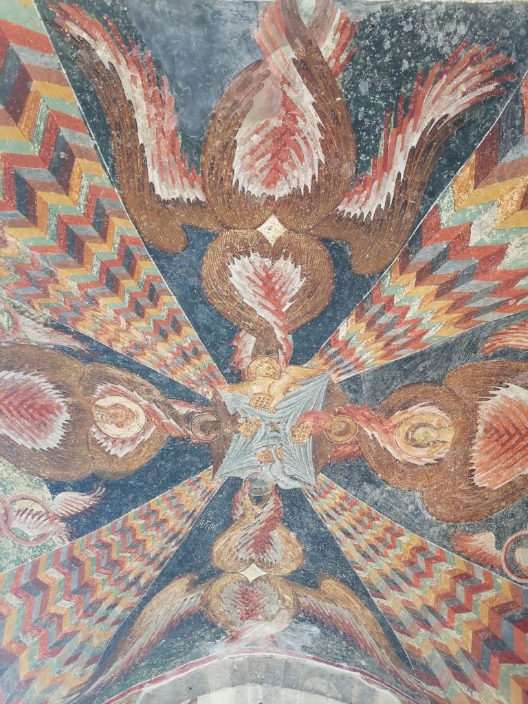 Yakın zamanda ciddi bir restorasyondan geçmiş, yukarıdan düşen kayaları çelik konstrüksiyonla sabitlemişler. Bu işte sıradan inşaat işçileri değil dağcılar çalışmış. Zaman içerisinde bir kısmı tahrip edilmiş ama hala seçilebilir İncil’den hikayeleri anlatan freskler var.