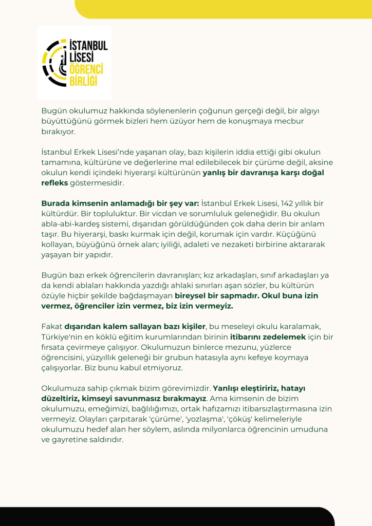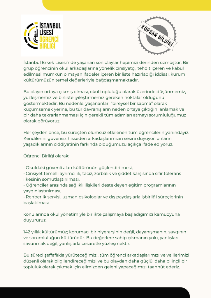 Haberlerde görmüş olabilirsiniz, ben Oksijen’in bülteninde okudum. İstanbul Erkek Lisesi 9.sınıf öğrencilerinden bir grup, kız öğrencileri “ölüm tehdidine taciz ve tecavüzü normalleştirmeye varan ifadeler”e maruz bırakmışlar. 11.sınıf erkek öğrencileri de onları darp etmiş. Kız öğrenciler olaylardan yaşadıkları dehşeti ve duyarsızlık karşısında hayal kırıklıklarını anlatan bir bildiri yayınlamışlar haklı olarak. Olay kamuoyuna yansıyınca Öğrenciler Birliği bir açıklama yayınlamış.