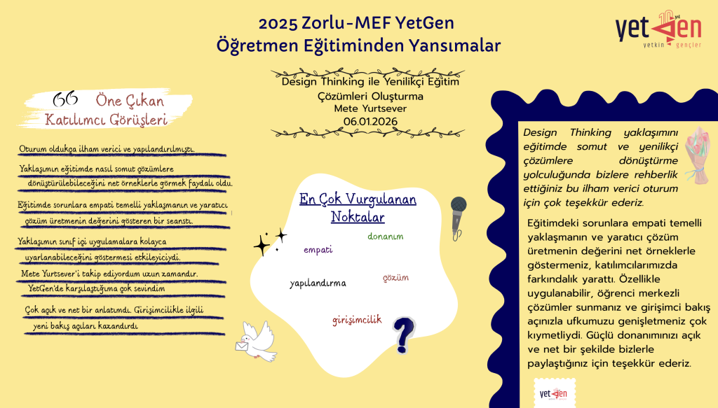YetGen için “Design Thinking ile Yenilikçi Eğitim Çözümleri Oluşturma” konulu bir aktarım yapmıştım. Öğrencinin ihtiyacına karşılık vermenin onun bağlamını, duygusunu anlamaktan geçtiğinin altını çizmiştim.