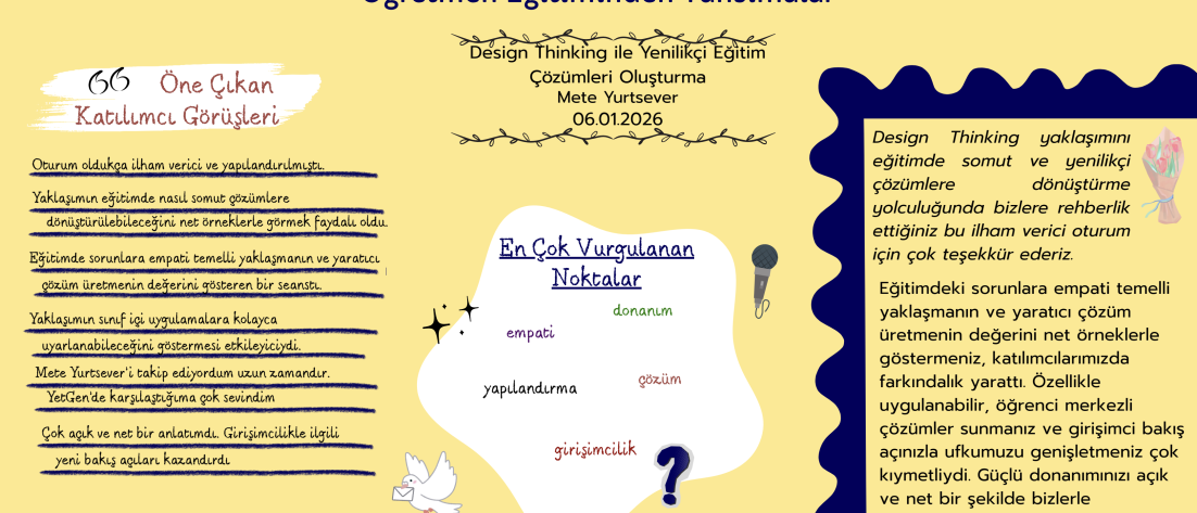 “Eğitimdeki sorunlara empati temelli yaklaşmanın ve yaratıcı çözüm üretmenin değerini net örneklerle göstermeniz, katılımcılarımızda farkındalık yarattı. Özellikle uygulanabilir, öğrenci merkezli çözümler sunmanız ve girişimci bakış açınızla ufkumuzu genişletmeniz çok kıymetliydi. Güçlü donanımınızı açık ve net bir şekilde bizlerle paylaştığınız için teşekkür ederiz.”